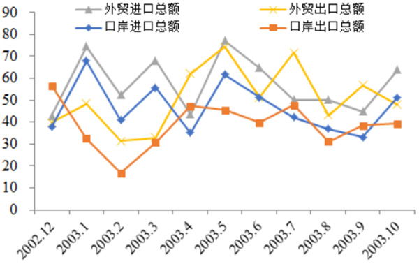 整體來看,非典疫情對于上海商品進出口影響不明顯。2002年12月至2003年10月,上海外貿進口和出口總額、口岸進口和出口總額增速是“鋸齒狀”波動狀態,維持在30%-70%之間。2003年1月出現的相對低谷,極有可能是由中國春節期間的停工歇業造成。從全年數據來看,2002年至2004年,上海進出口總額增長速度分別為21.8%、37.1%、35.7%。并未發現2003年上海進出口總額增速有明顯下滑。