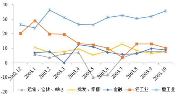 第二,對工業總產值增速影響較小。2003年,上海重工業總產值增速較為穩定,只在4月和5月出現了小幅下滑。雖然2003年上海輕工業產值增速出現了趨勢明顯下滑,但并沒有因非典出現斷崖式下滑。
