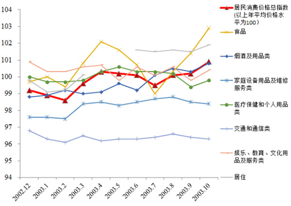 第二,非典疫情對零售商品價格產生結構性影響。在非典疫情影響下,2003年上海居民消費者價格總指數在4至6月出現一個波峰,其值均超過100;其他價格指數在4月與5月超過100的有食品、醫療保健和個人用品。上海食品價格指數受非典疫情影響最大,其波動與疫情周期基本同步。上海食品價格指數在2003年4月與5月處于較高位置,分別為102.1和101.6。非典疫情期間,食品價格波動與食品特性及疫情防控有關。在食品保質期較短的影響下,食品存量有限;受制于非典防控,食品生產供給受阻。醫療保健和個人用品價格指數受疫情影響也非常明顯,影響周期較長。醫療保健和個人用品價格指數在4月至8月之間全部超過100。受非典疫情影響,娛樂、教育、文化用品及服務價格指數在5月跌落至99.8。非典疫情期間,上海居民外出大幅減少,具有人員接觸較多特性的娛樂等服務業客源較少,因此其價格也會出現下降。